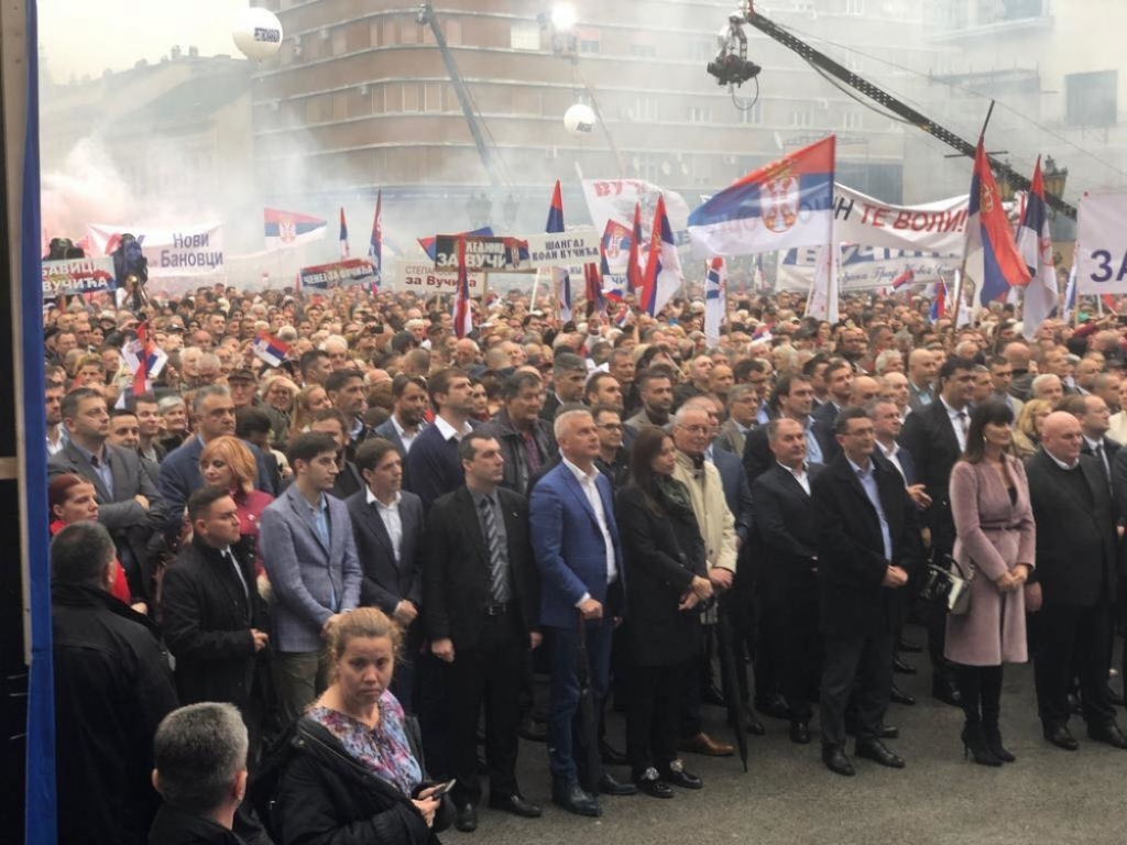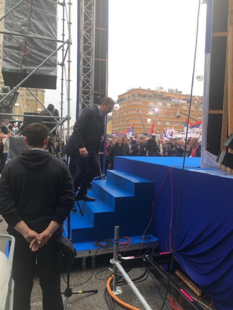 18.25 - Predsednik Vučić je na početku svog obraćanja, zamolio prisutne da spuste transparente kako bi se videlo koliko je ljudi došlo na miting, a potom se zahvalio svima koji su došli.