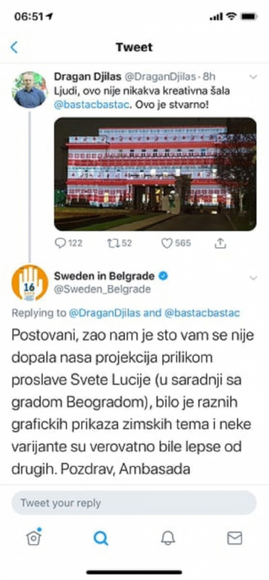 "Poštovani, žao nam je što vam se nije dopala naša projekcija prilikom proslave Svete Lucije ( u saradnji sa gradom Beogradom), bilo je raznih grafičkih prikaza zimskih tema i neke varijante su verovatno bile lepše od drugih. Pozdrav, Ambasada", piše na njihovom zvaničnom nalogu.
