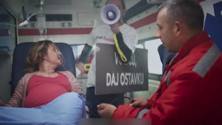 Naime, majka se uvija u porođajnim bolovima, budući otac skandira: "Vučiću, ostavka!".