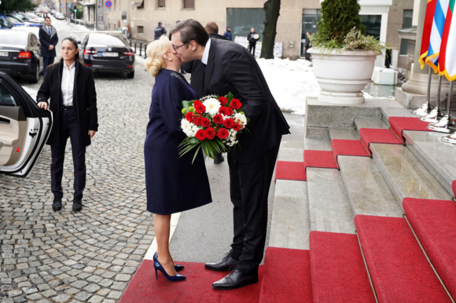 Kada je Dančila izlazila iz automobila, srpski predsednik joj je poželeo dobrodošlicu i uručio buket crvenih ruža, što je, sudeći po reakcijama, oduševilo rumunsku premijerku.
