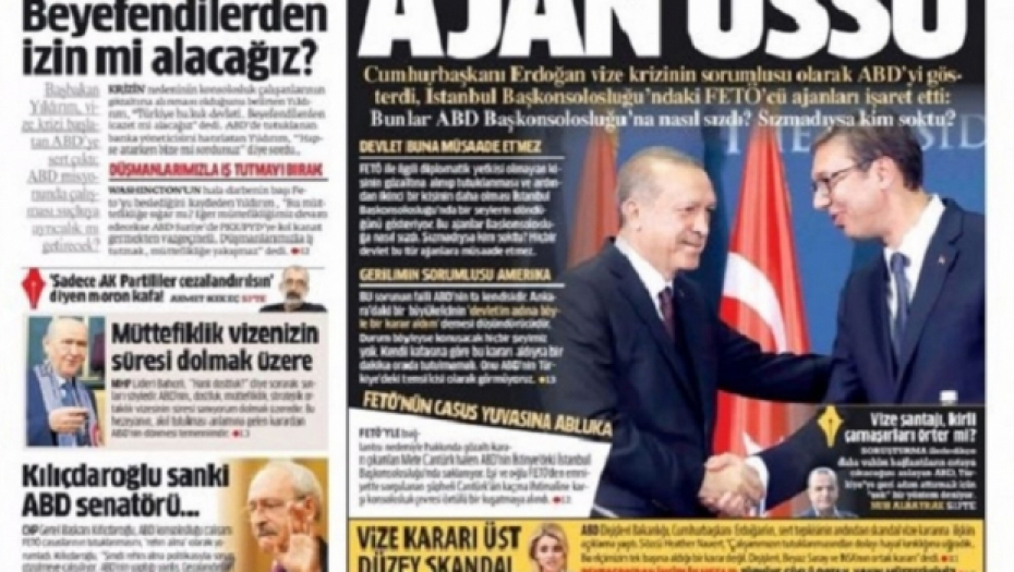 Dnevnik Karar na naslovnici, pak, donosi izjavu predsednika Erdogana, koji je na konferenciji za novinare tokom zvanične posete Srbiji optužio američkog ambasadora u Ankari Džona Basu da je odgovoran za ukidanje američkih viza turskim građanima.