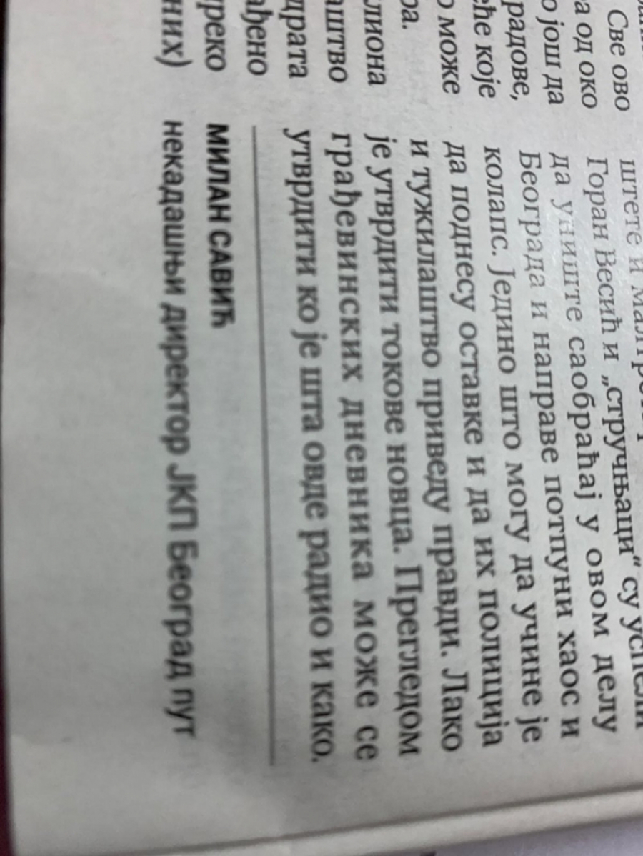 - NIN je list sa veoma dugom tradicijom u kome su pisali ljudi koji su značajni ne samo za srpsko novinarstvo već i kulturu i društvo. Nažalost, od kada vi uređujete ovu novinu ona je postala sredstvo za obračun sa predsednikom Aleksandrom Vučićem ne samo da imate sve manje čitalaca već i očigledno nemate ni kriterujum koga pozivate da piše za novinu. Tako ste u prošlom broju objavili kolumnu izvesnog Milana Savića, koji se potpisao kao bivši direktor Beograd puta. Taj čovek jeste bivši direktor Beograd puta ali ste sakrili od svojih čitalaca činjenicu da je 2005. godine hapšen zbog malverzacija u ovom preduzeću a potom i osuđen na zatvorsku kaznu. Pretpostavljam da ste to rekli čitaocima niko ne bi verovao onome što je Savić napisao.