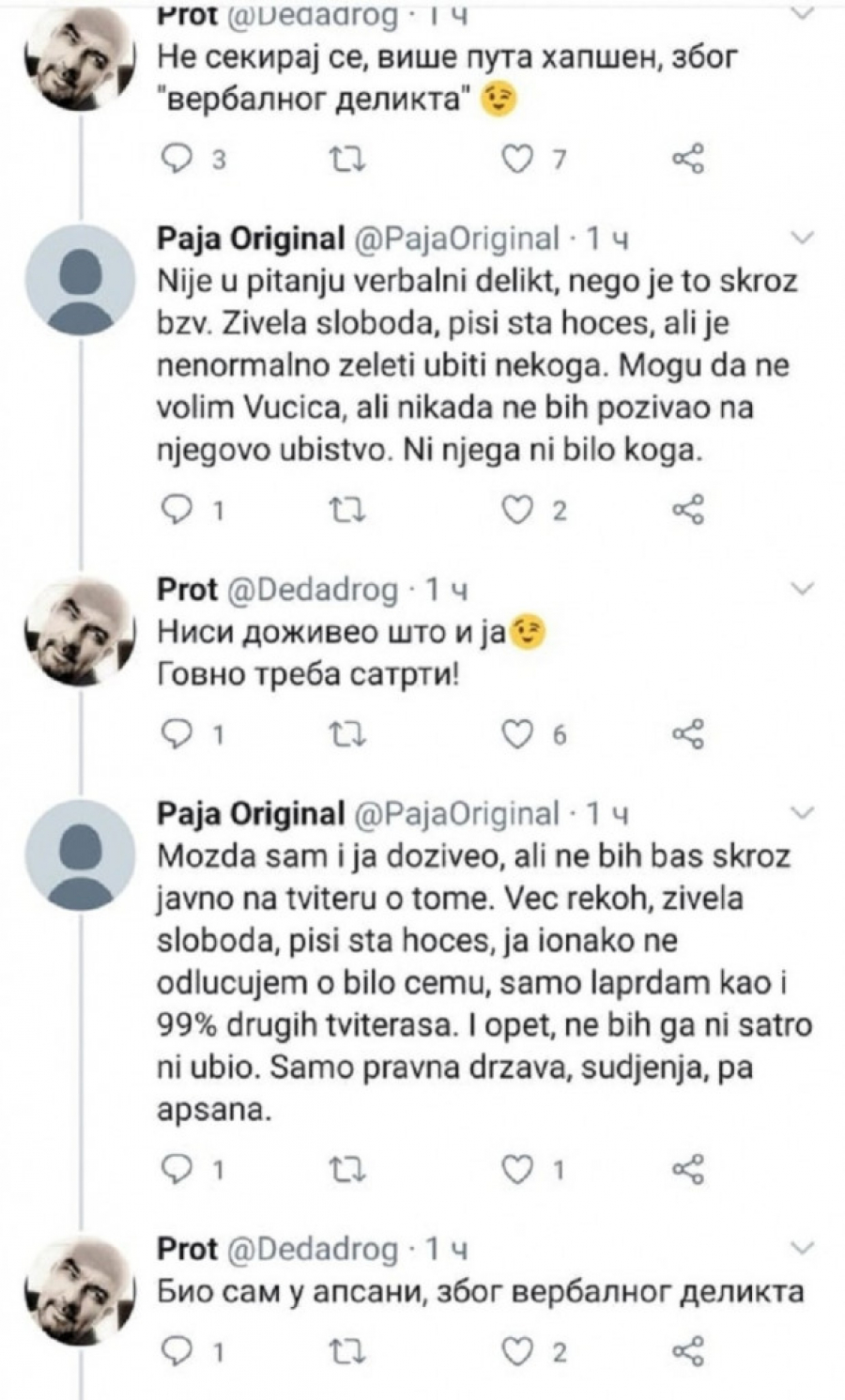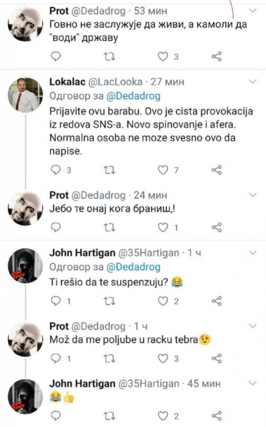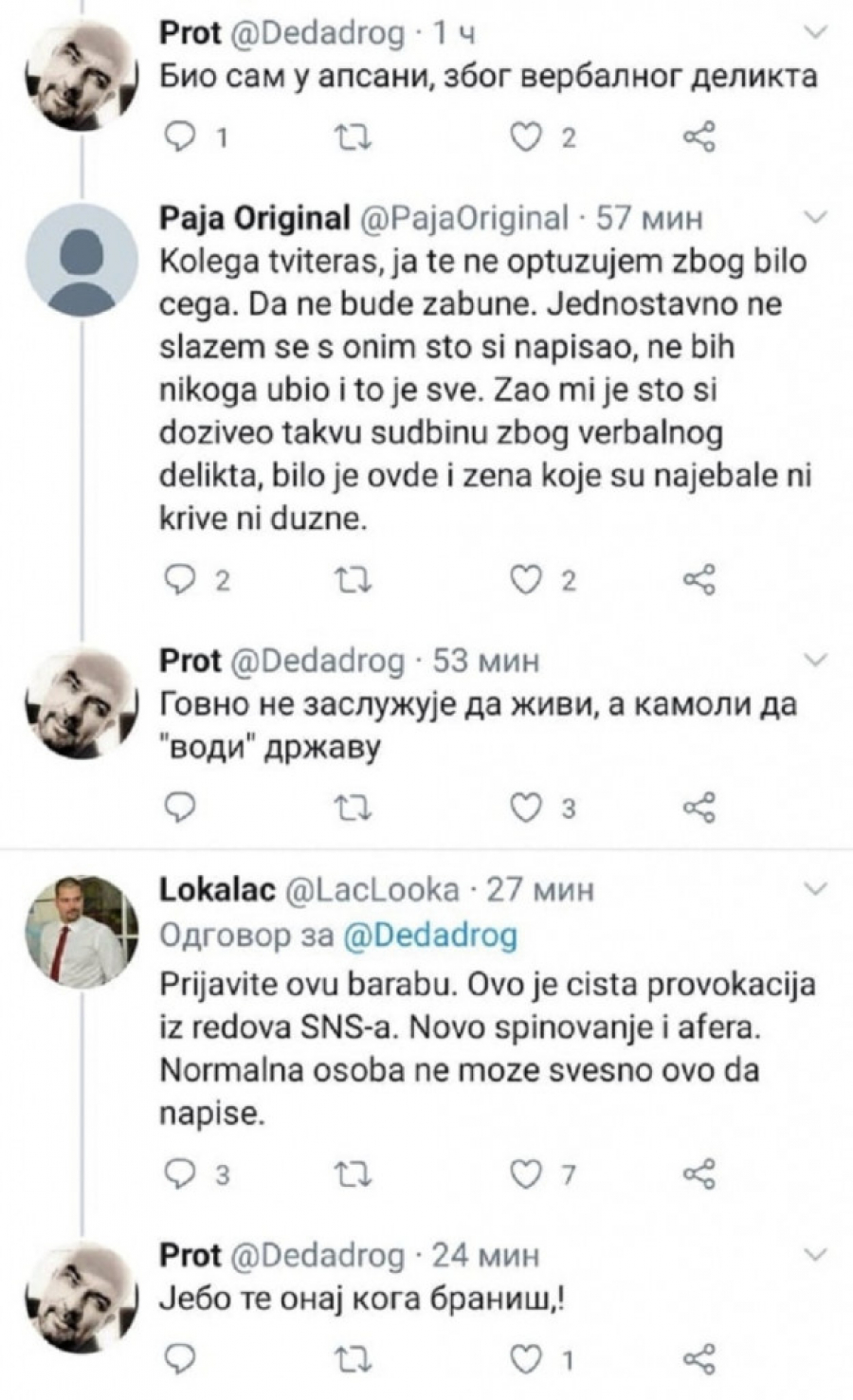 Ovaj lik koji tvituje o ubistvu je verovatno uspavan pogledao sebe u ogledalu i izustio, napisao tvit.Stvarno treba proveriti bezbednosne sluzbe u bolnici ``Laza Lazarevic``.Izgleda da se desila bezanija bolesnika u doba korone.Ludake u bolnicu ili zatvor.