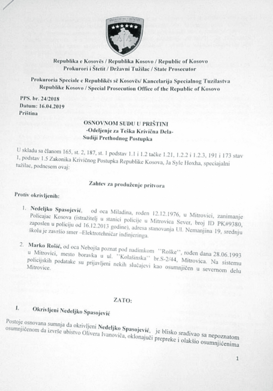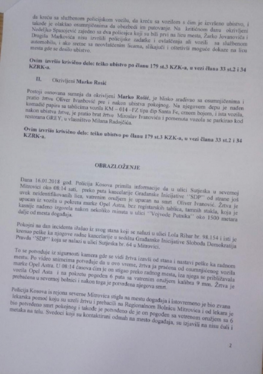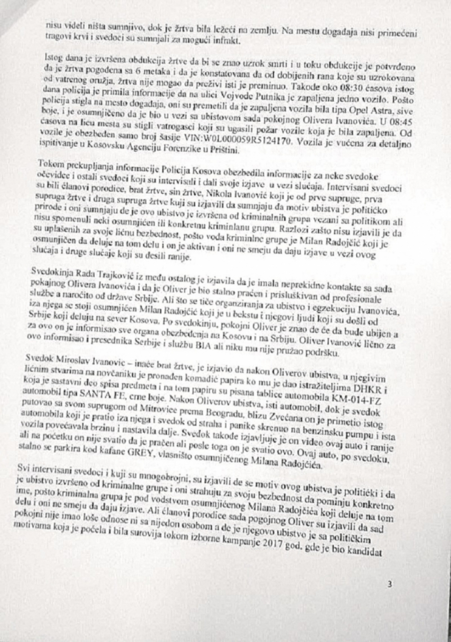Dalje je pročitao da u tom aktu stoji da su iza prisluškivanja i praćenja stajali Milan Radoičić i njegovi ljudi koji su došli iz Srbije, te da je izjavila da je Oliver Ivanović znao da će biti ubijen, da je molio predsednika i institucije Srbije da ga zaštite, ali da mu niko nije pružao podršku.
