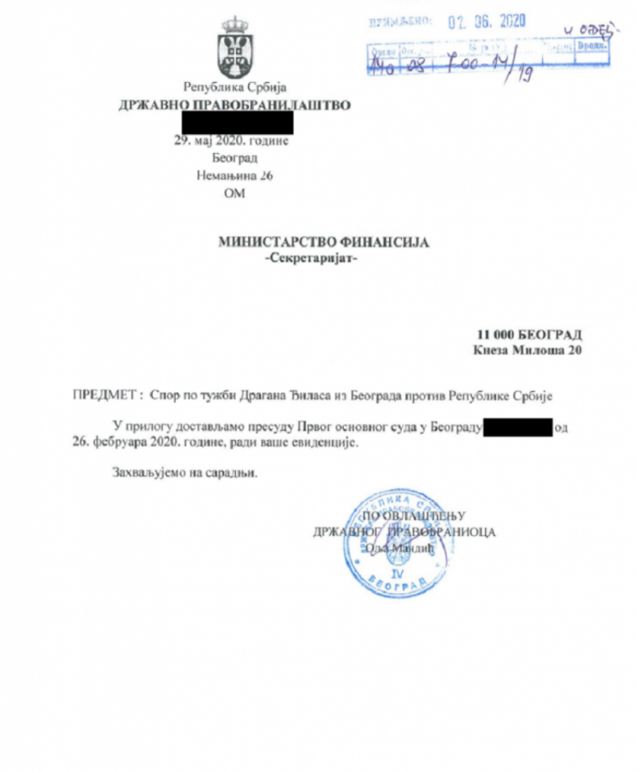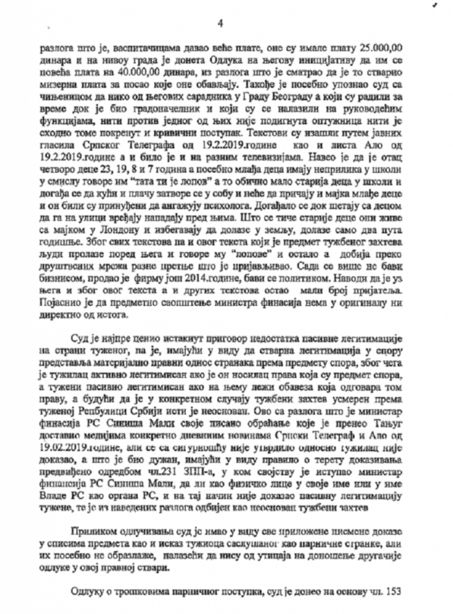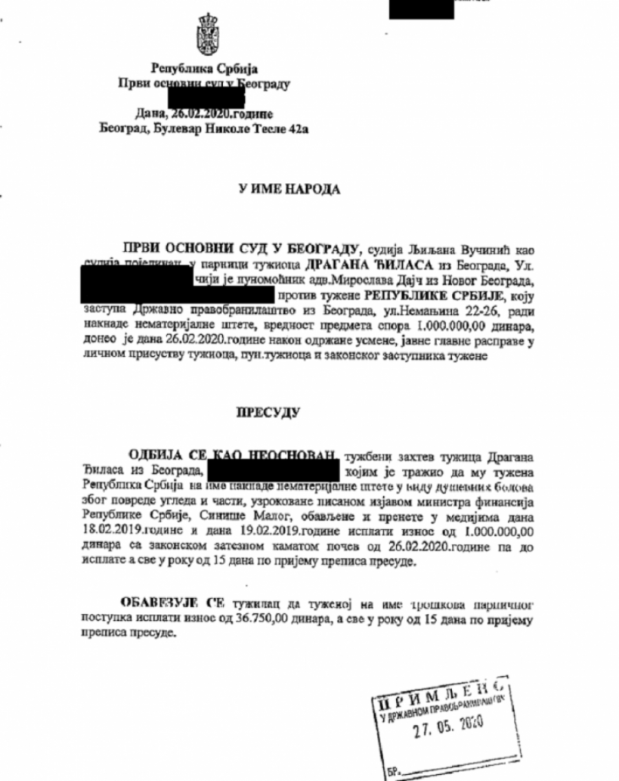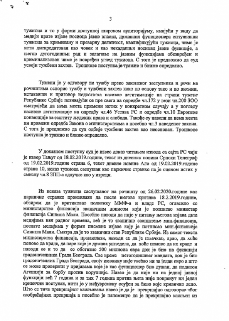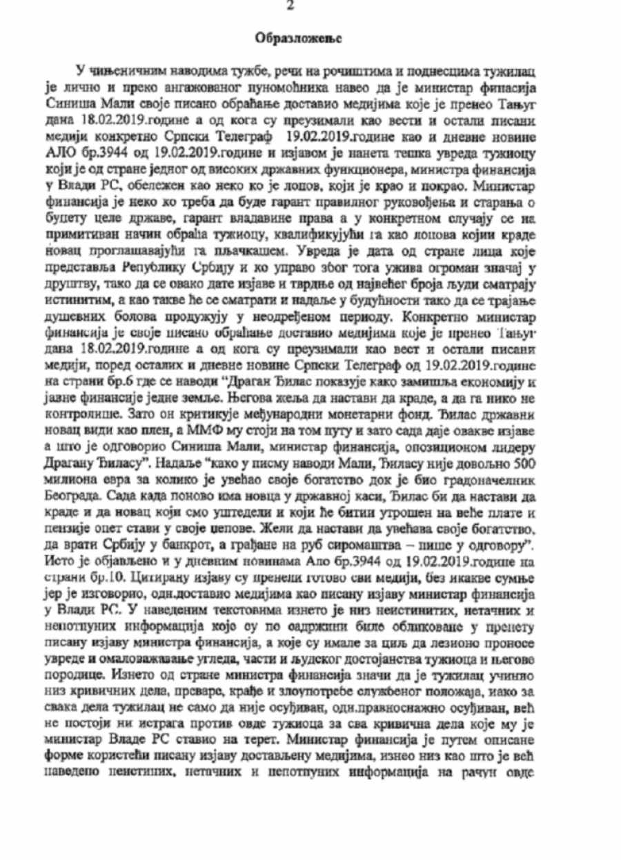 - Odbija se kao neosnovan, tužbeni zahtev tužioca Dragana Đilasa iz Beograda, kojim je tražio da mu tužena Republika Srbi na ime naknade nematerijalne štete u vidu duševnih bolova zbog povrede ugleda i časti, uzrokovane pisanom izjavom ministra finansija Republike Srbije, Siniše Malog, obavljene i prenete u medijima, dana 18.2.2019. godine i dana 19.02.2019. godine isplati iznos od 1.000.000,00 dinara sa zakonskom zateznom kamatom počev od 26.02.2020. godine pa do isplate a sve u roku od 15 dana po prijemu prepisa presude. Obavezuje se tužilac da tuženom na ime troškova parničnog postupka isplati iznos od 36.760,00 dinara, a sve u roku od 15 dana po prijemu presude - navodi se u presudi.