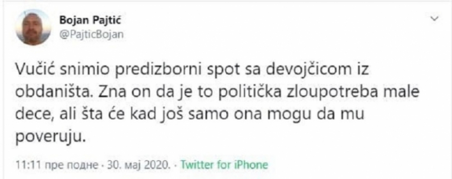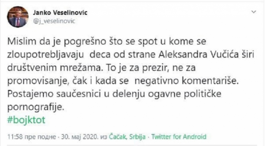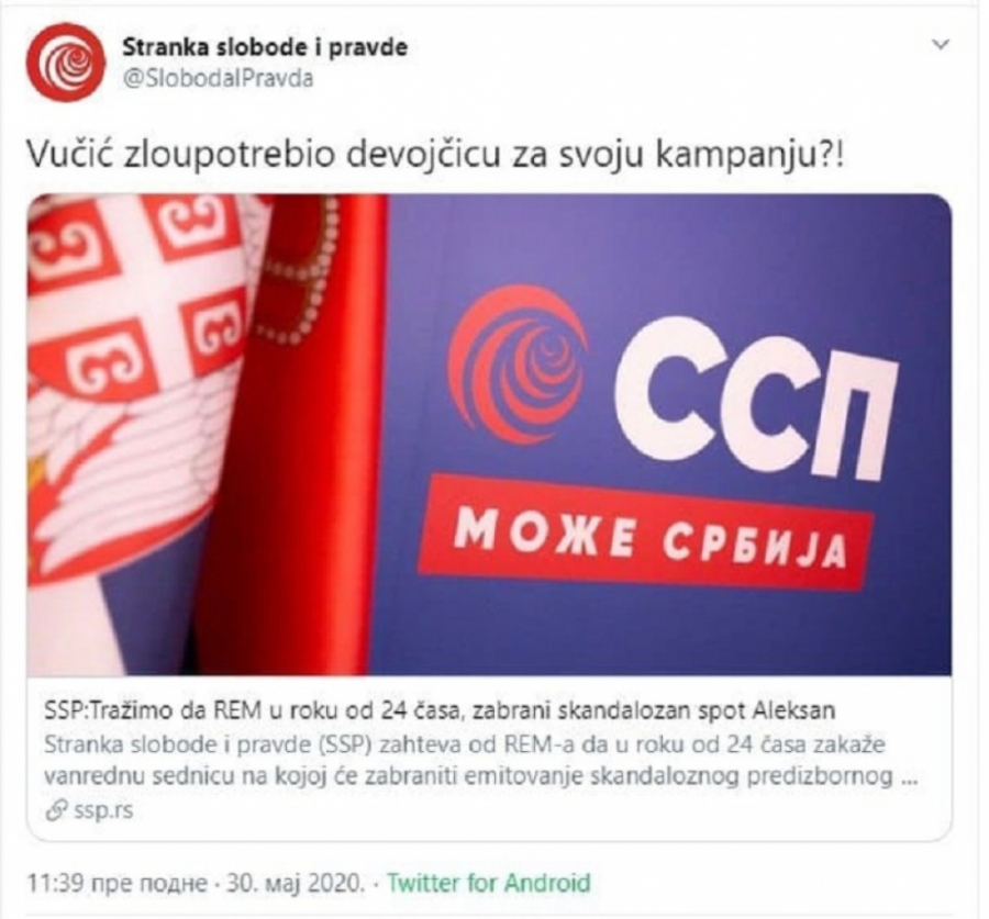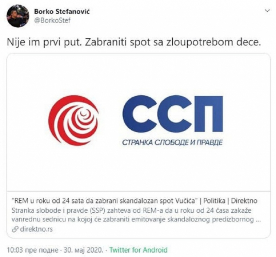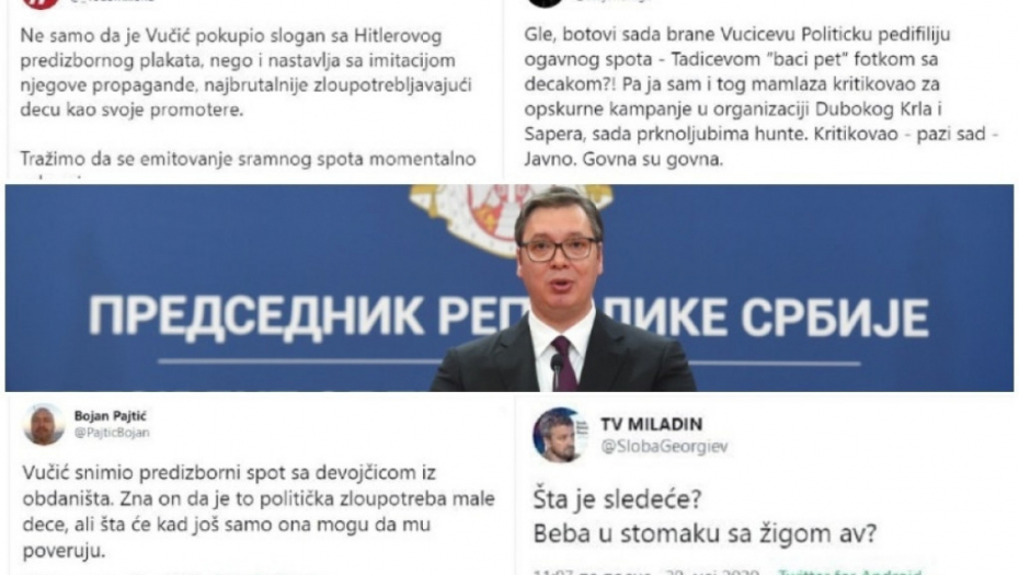 - Samo sam se pitao šta će licemeri sada da nađu. Ne čudim se, to u diktaturi kakvu oni priželjkuju tako ide. Ako nadležni organi odluče da zabrane spot, prihvatićemo odluku, ali ne zaboravite da su oni koji sada traže zabranu imali decu u svojim spotovima, imali su ih najmanje 50, i Đilas i Tadić. Mi imamo saglasnost roditelja, u spotu nema ružnih reči, ne znam šta im smeta. Ali, njima ustvari sve smeta, nikad im nije dobro. Ni kad gradimo pruge, ni kad pravimo puteve, ni kad snimamo spotove... Jedino da izađem sa saopštenjem da ljudi terba da glasaju za njih, možda bi im to bilo dovoljno - rekao je Vučić.