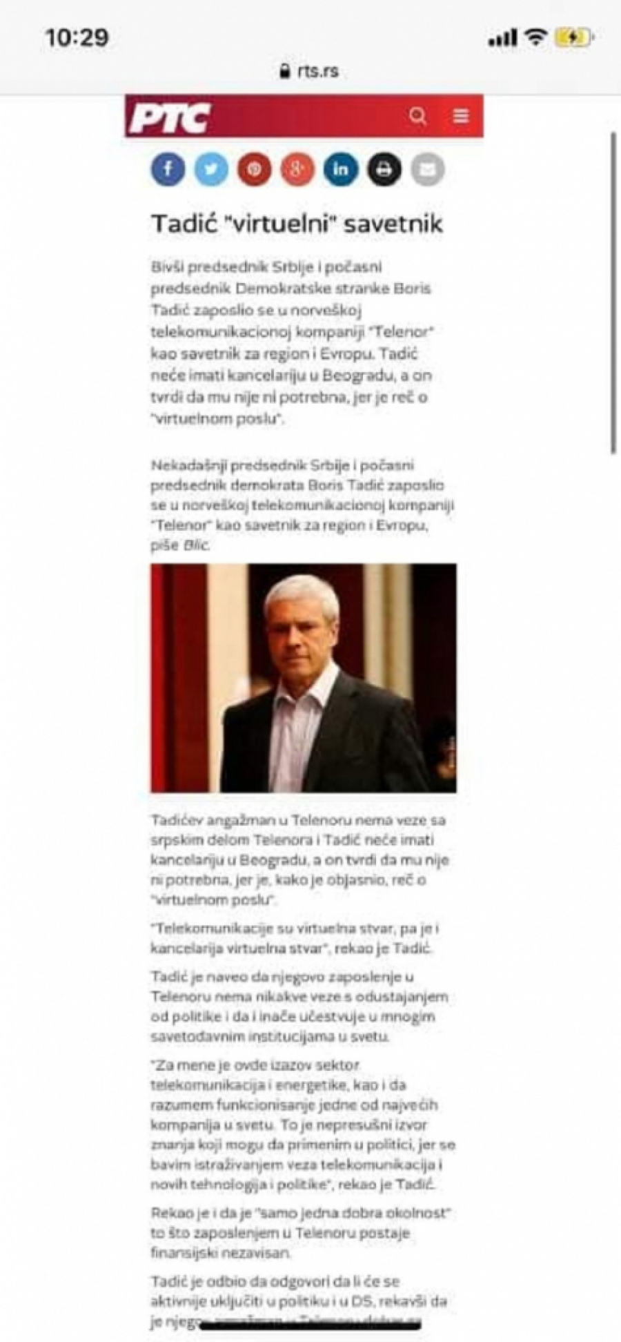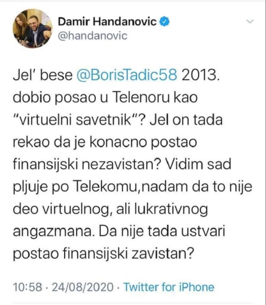 - Jel beše Boris Tadić 2013. dobio posao u Telenoru kao "virtuelni savetnik"? Jel on tada rekao da je konačno postao finansijski nezavistan? Vidim sad pljuje po Telekomu, nadam se da to nije deo virtuelnog, ali lukrativnog angažmana. Da nije tada u stvari postao finansijski zavistan? - napisao je Damir Handanović na svom Tviter nalogu.