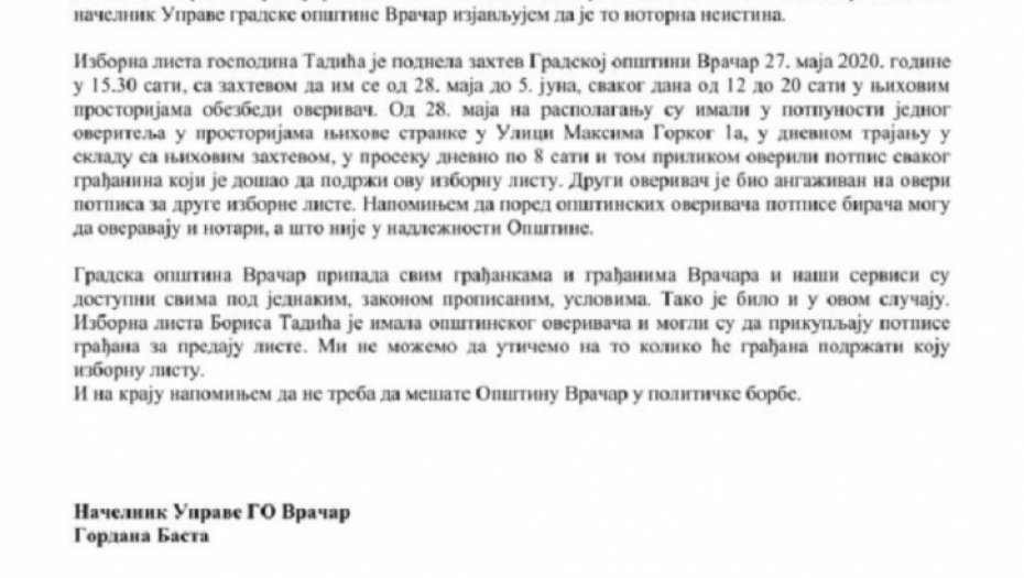 - Izborna lista gospodina Tadića je podnela zahtev Gradskoj opštini Vračar 27. maja 2020. godine u 15.30 sati, sa zahtevom da im se od 28. maja do 5. juna, svakog dana od 12 do 20 sati u njihovim prostorijama obezbedi overivač. Od 28. maja na raspolaganju su imali u potpunosti jednog overitelja u prostorijama njihove stranke u Ulici Maksima Gorkog 1a, u dnevnom trajanju u skladu sa njihovim zahtevom, u proseku dnevno po 8 sati i tom prilikom overili potpis svakog građanina koji je došao da podrži ovu izbornu listu. Drugi overivač je bio angaživan na overi potpisa za druge izborne liste. Napominjem da pored opštinskih overivača potpise birača mogu da overavaju i notari, a što nije u nadležnosti Opštine.