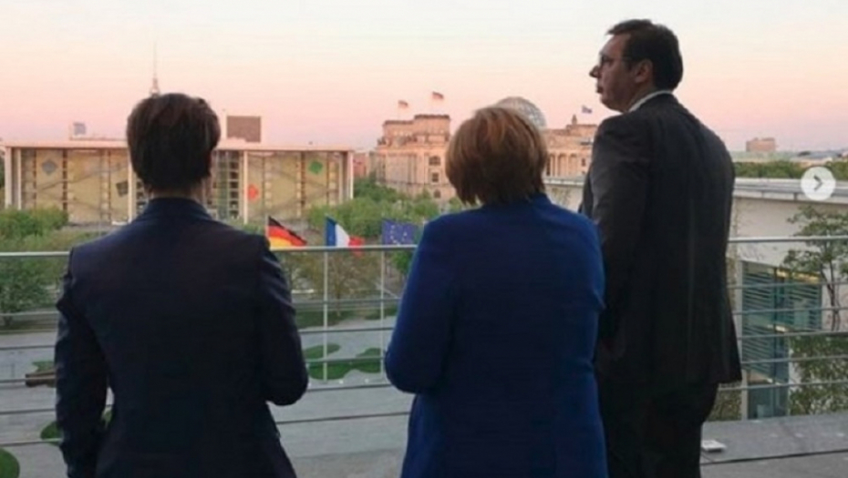 Na jednoj od slika u razgovoru, pored Vučića, Merkelove i Makrona, učestvuje i albanski premijer Edi Rama, kao i predstavnici Prištine.