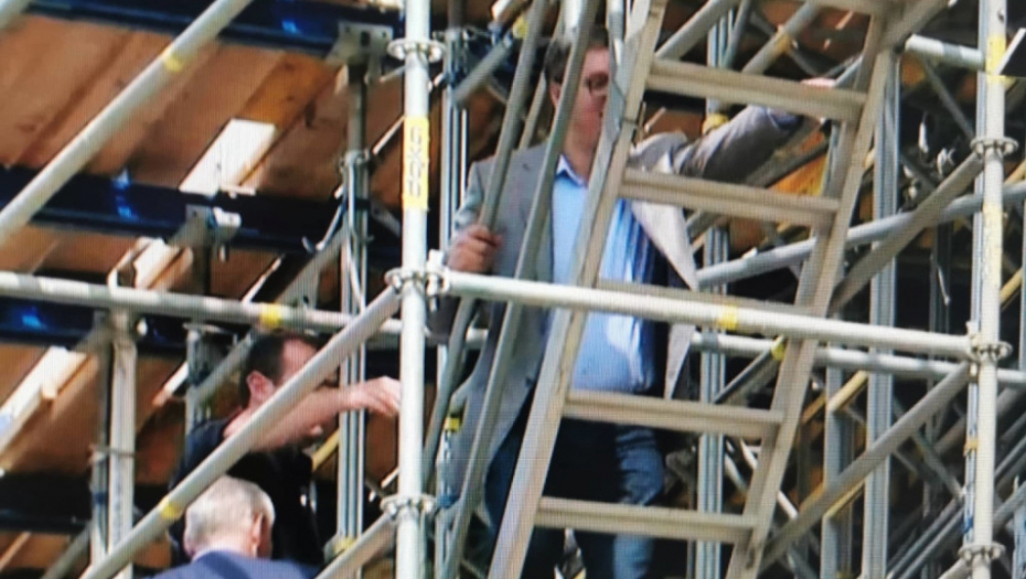 - Je l možemo da se popnemo gore? Ne možemo?! Ma baš me briga za obezbeđenje, jedino se brinem za novinare. Vi nemojte, ja moram da vidim kako to izgleda gore! - bio je uporan predsednik, koji se par minuta kasnije popeo uz skelu.