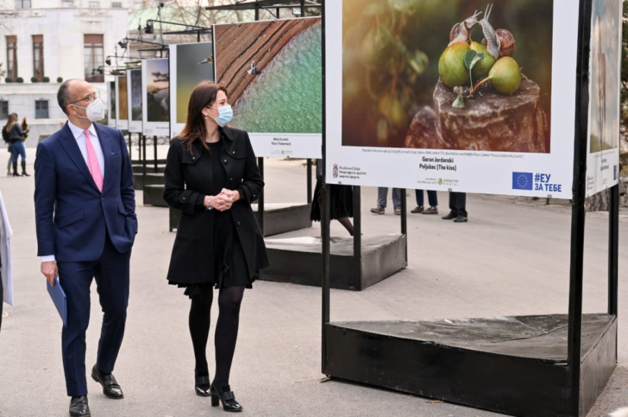 - Želim da čestitam od srca svim autorima fotografija. Svi oni su pobedili, jer su nam približili prelepe pejzaže i podsetili na bogatstva Srbije kada je reč o životinjskom i biljnom svetu. Izuzetno mi je drago što su stavili akcenat i na zaštićena područja, o kojima će i Ministarstvo zaštite životne sredine u narednom periodu posebno brinuti i trudićemo se zajedno da ih očuvamo. Ova izložba podiže i svest o značaju životne sredine i pozivam građane da pogledaju postavku koja će biti otvorena do kraja aprila. Intenzivno radimo na projektu mreža Natura 2000, i zahvaljujući tome identifikujemo vrste i staništa. Ovaj projekat ne bi uspeo, da nemamo snažnu podršku Evropske unije, i zato se zahvaljujem gospodinu Fabriciju i nadam se da smo bili dobri partneri. Očekujem da ćemo učestvovati u mnogim drugim projektima, s obzirom da je njihovo iskustvo i podrška od izuzetnog značaja za našu zemlju i za naše ministarstvo – rekla je ministarka Irena Vujović.