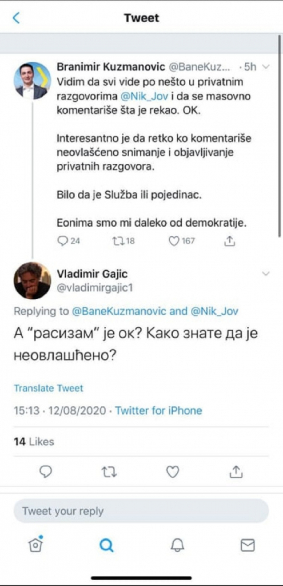 Na to se nadovezao Vladimir Gajić šef pravnog tima Jeremićeve Narodne stranke i upitao Kuzmanovića otkud zna da su razgovori snimljeni neovlašćeno, a potom ironično dodao da je Jovanovićev rasizam za neke sasvim u redu.