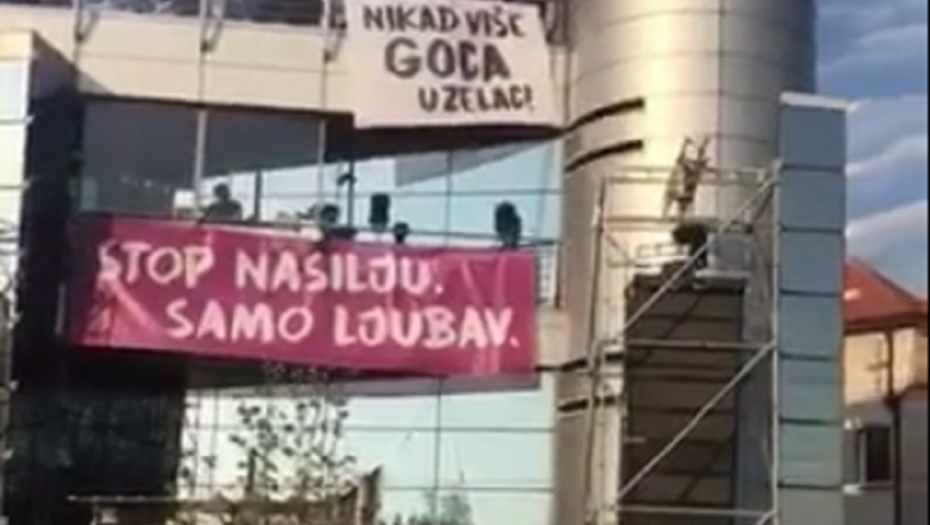 Inače, na zgradi TV Pink istaknuti transprenti, a ispred postavljeni stolovi sa flašicama vode i drugim pićima.