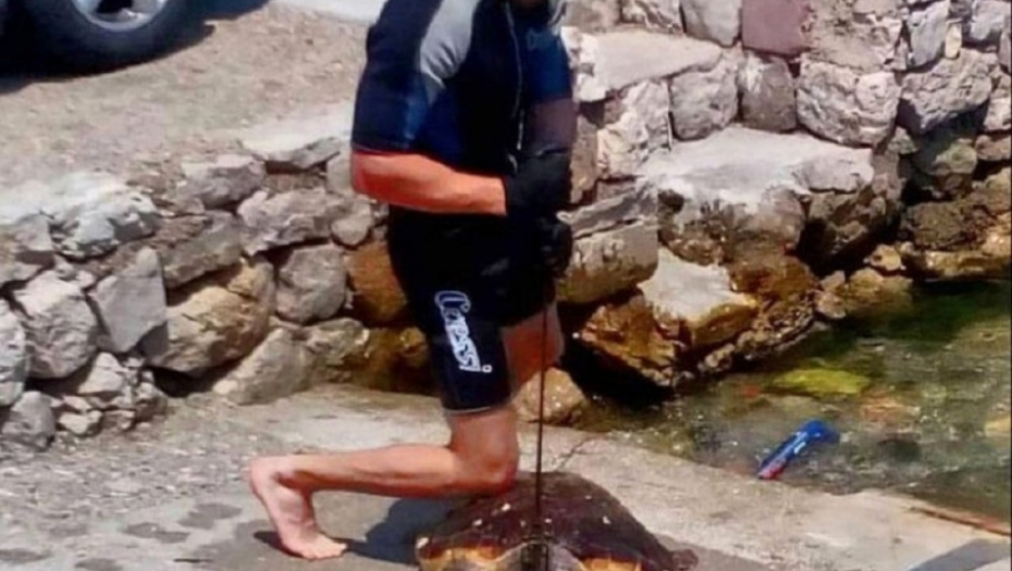 Na društvenim mrežama objavljena je fotografija na kojoj se vidi mladić sa trozupcem pored kornjače ispod koje se vidi krv.