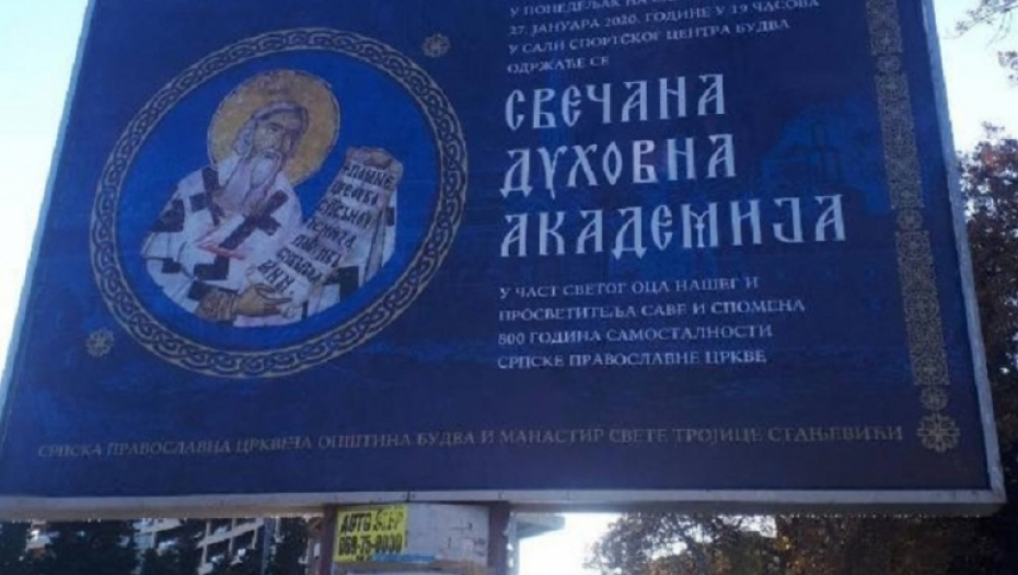 “U čast svetog oca našeg i prosvetitelja Save i spomena 800 godina samostalnosti Srpske pravoslavne crkve”, piše na desetak bilborda u gradu kojima se najavljuje svečana duhovna akademija “Uskliknimo s ljubavlju”, koju 27. januara u 19 časova u Mediteranskim sportskim centru organizuju Srpska pravoslavna crkvena opština Budva i manastir Svete Trojice - Stanjevići.