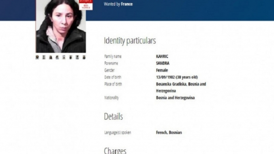 Naime, Francuska policija obratila se Interpolu koji je raspisao poternicu za Sandrom Kahrić koja je rođena u Bosanskoj Gradišci 13. septembra 1982. godine, te da govori bosanski i francuski jezik.