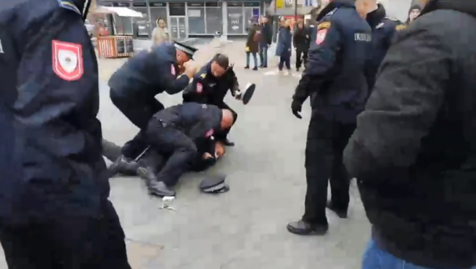 U jednom momentu prvo je došlo do naguravanja s policajcem, koji je potom pao, a jedna osoba jeste udarila policajca, dok nikakvog grupnog napada na policajca nije bilo i tvrdnja da ga je više osoba "šutiralo" je netačna.