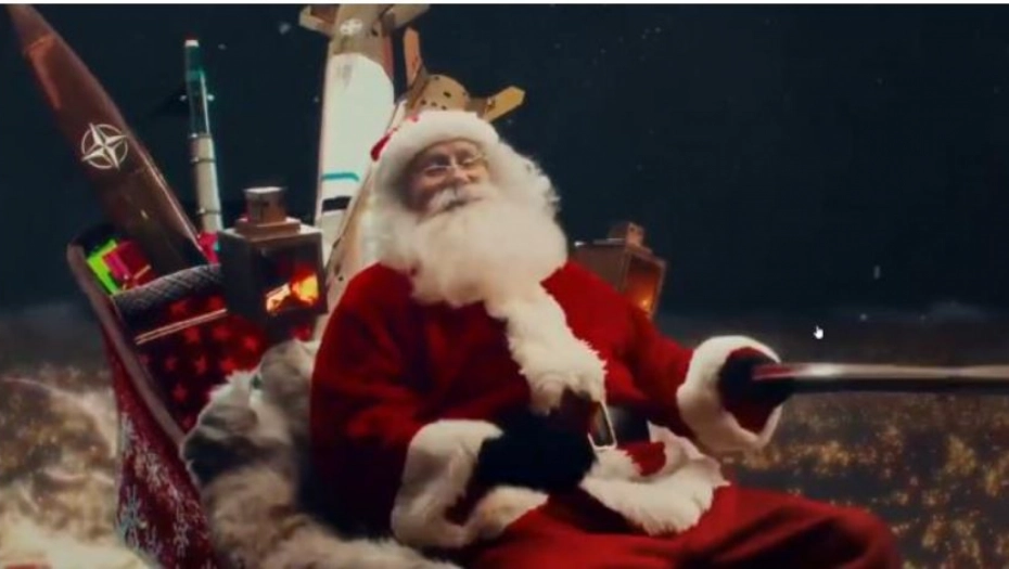 Ono što je posebno zanimljivo je to što Deda Mraz umesto novogodišnjih poklona u sankama ima rakete, a na jednoj je istaknut i prepoznatljiv NATO znak.