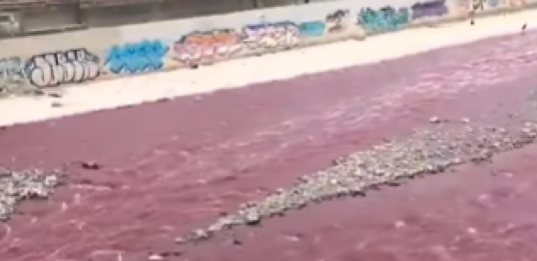 Na snimku se vidi kako posmatrači sa užasom gledaju dole sa mosta u vodu crvene boje.