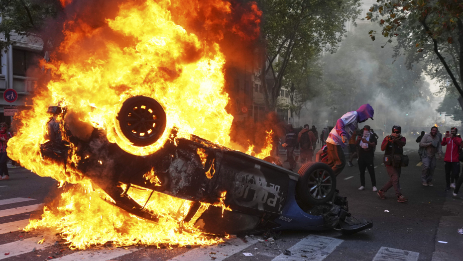 Ispred Kongresnog trga prevrnut je i zapaljen patrolni automobil gradske policije, kao i desetine kontejnera za smeće.