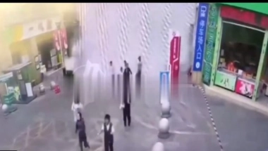 Na snimku se vidi kako voda zapljuskuje petnaestak ljudi koji su u tom trenutku prolazili pored te zgrade.