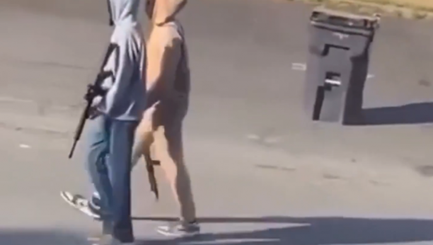 Kako se može videti na snimku, dvojica maskrinih muškaraca snimljena su kako drže duge cevi nasred ulice.