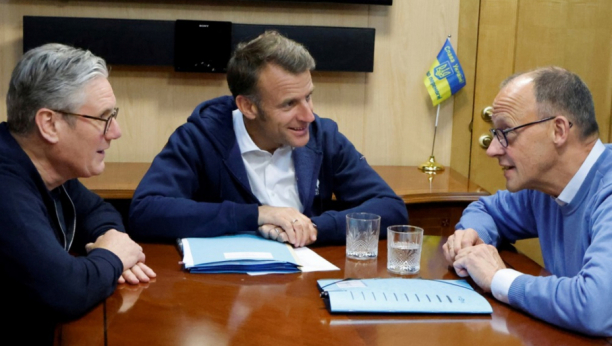 Druga fotografija prikazuje širi kadar na kojem se nalaze Emanuel Makron, Kir Starmer i Fridrih Merc.