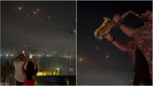 Na snimku se vide ljudi kako uživaju na žurci na krovu zgrade u Bejrutu, u Libanu, dok noćno nebo seku projektili tokom razmene raketnih napada između Irana i Izraela.