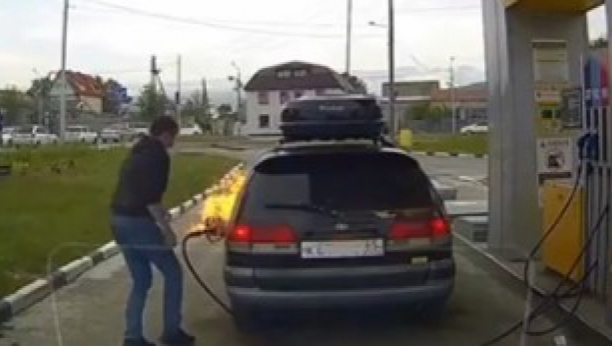 Na snimku se vidi kako se zapalio crevovod benzinske pumpe i automobil, ali vozač nije paničio odmah je odbacio crevo i pokušao da ugasi požar jaknom.