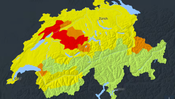 Švajcarska služba za uzbunu poziva javnost da ostane u zatvorenom prostoru i izbegava otvorene prostore i šume. Očekuju se jake kiše, grad i oluje.