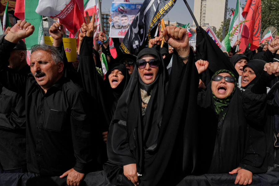 Okupljeni građani nosili su crnu odeću u znak žalosti i uzvikivali parole podrške Islamskoj Republici i njenim vojnim liderima.