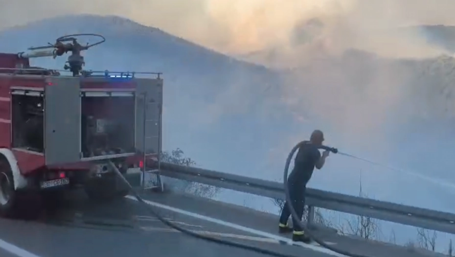 Gori šuma i nisko rastinje, a saobraćaj na putu sa kog se može videti vatrena stihija, zasad neometano funkcioniše.