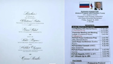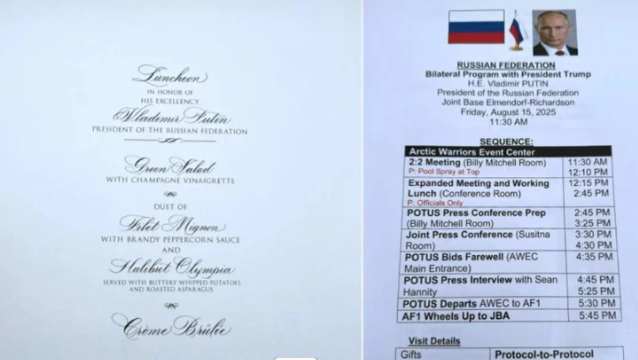 Stranice 6 i 7 detaljno su opisivale protokol predviđenog ručka u čast Putina, koji je kasnije otkazan. Raspored sedenja je pokazivao da su Trump i Putin trebali sedeti jedan nasuprot drugome, dok bi uz Trampa bili državni sekretar Marco Rubio, ministar odbrane Pete Hegseth i šefica kabineta Susie Wiles s desne strane, te ministar finansija Scott Bessent, ministar trgovine Howard Lutnick i specijalni izaslanik Steve Witkoff s leve strane. Putina su pratili ministar spoljnih poslova Sergej Lavrov i savetnik za međunarodnu politiku Jurij Ušakov.