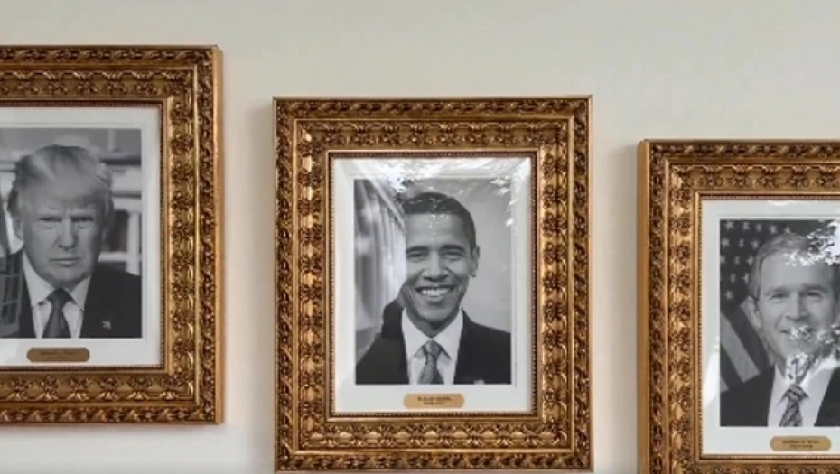 Bil Klinton, Džordž Buš, Barak Obama, Donald Tramp, automatska olovka, Donald Tramp - ovim redosledom poređani su portreti američkih predsednika u Beloj kući, ili bar skoro svih lidera, posle odluke aktuelnog lidera SAD da zameni portret svog prethodnika Džoa Bajdena slikom uređaja za potpisivanje dokumenata