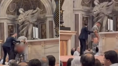 Video prikazuje čoveka sa pantalonama oko članaka. Stotine užasnutih turista i vernika posmatralo je u šoku tokom incidenta koji se dogodio tokom mise.