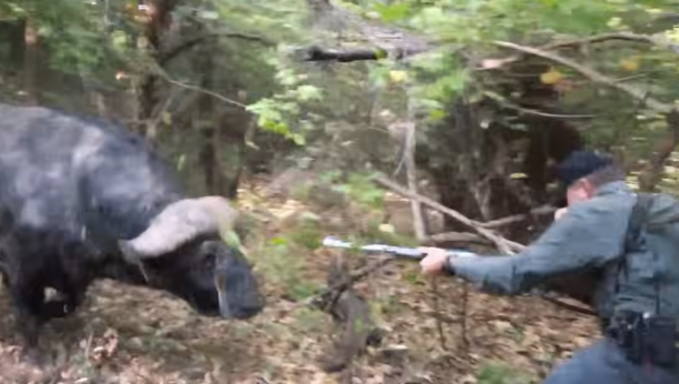 (UZNEMIRUJUĆI SNIMAK) Divlji bivo se zaleteo, lovci pucaju ali kasno - nakon udarca rogovima ostali samo krv i prašina