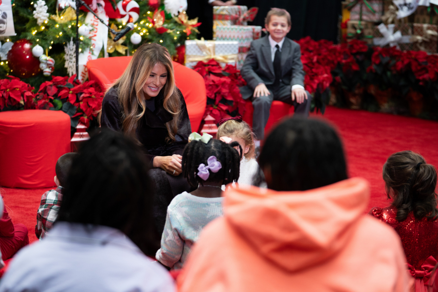 Dobrodošlicu su joj poželeli dvoje pacijenata, 11-godišnji dečak i petogodišnja devojčica, koji su je odveli do svečano ukrašene sale u Dečijoj nacionalnoj bolnici u američkoj prestonici. Prva dama je sedela u velikoj crvenoj stolici ispred visoke novogodišnje jelke i čitala priču Maka Barneta “Kako se Deda Mraz spušta niz dimnjak?” grupi od dvadesetak malih pacijenata i ostalim okupljenima.