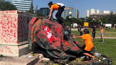 Noseći narandžaste košulje u čast dece domorodačkih naroda, koja su poslata u zloglasne internate u zemlji, članovi grupe ostavili su na statui i njenom postolju crvene otiske ruku, kao i znak s natpisom: "Jednom smo bili deca. Vratite ih kući".