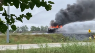 Teretnjak u jednom trenutku gubi kontrolu, udara u zaštitnu barijeru i prevrće se na stranu.
