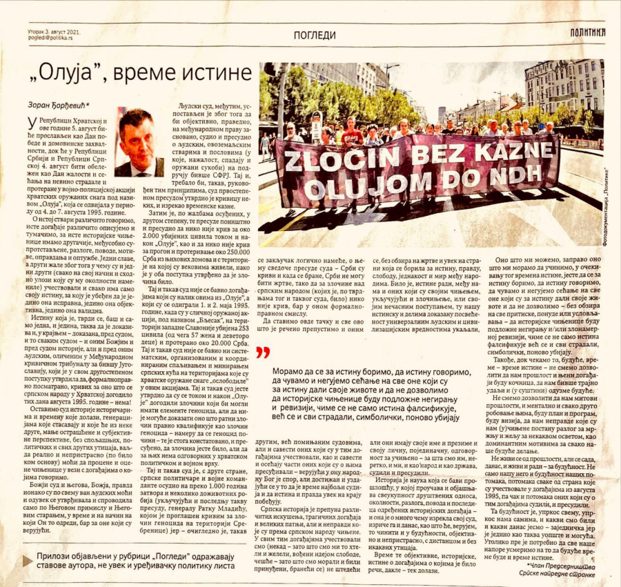 Ne živi se od prošlosti, ali se sada, danas, i živi i radi - za budućnost. Ne samo našu, nego i budućnost naših potomaka, potomaka svake od strana koje su učestvovale u događajima iz avgusta 1995., pa čak i potomaka onih koji su o tom događajima sudili, i presudili.