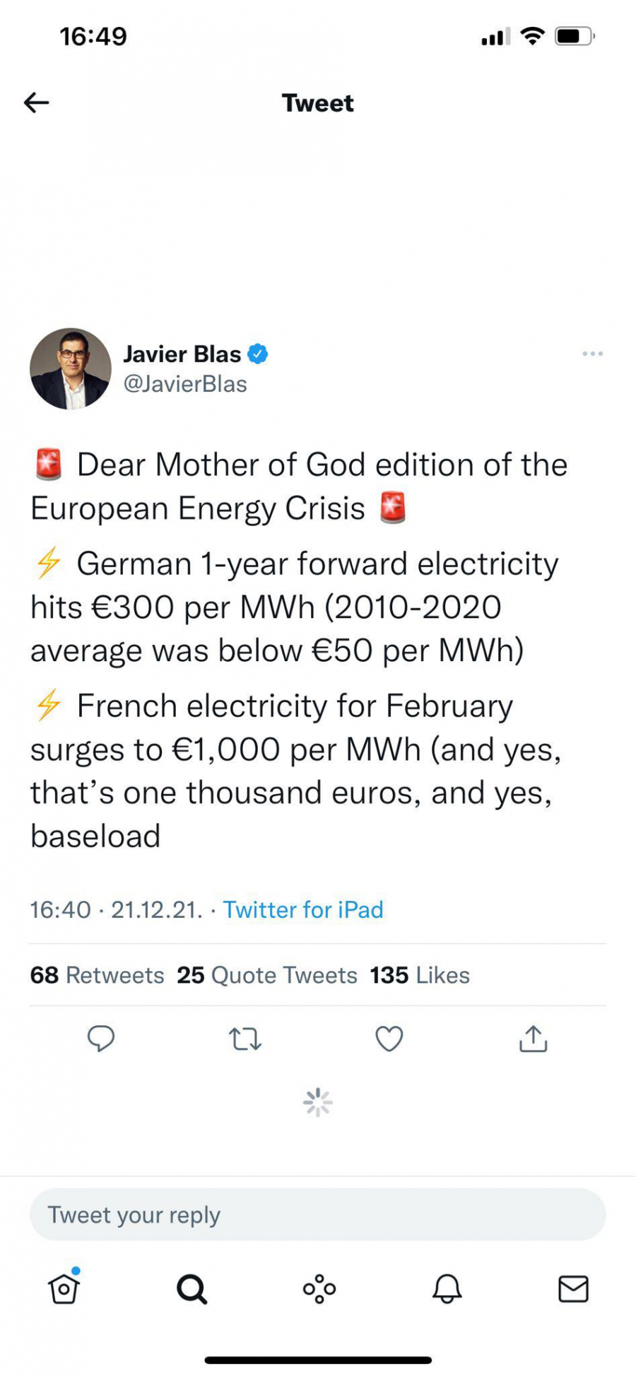 Evropska energetska kriza postala je još gora u utorak jer su nestašica prirodnog gasa, prekidi rada nuklearnih elektrana, opadanje proizvodnje energije vetra i hladno vreme podigli cene.
