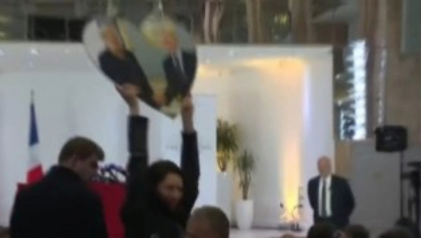 Konferencija za štampu francuske predsedničke kandidatkinje Marin Le Pen prekinuta je u jednom trenutku nakon što je žena iz publike podigla poster sa fotografijom Le Penove i Putina u obliku srca, prenosi "Le Mond".