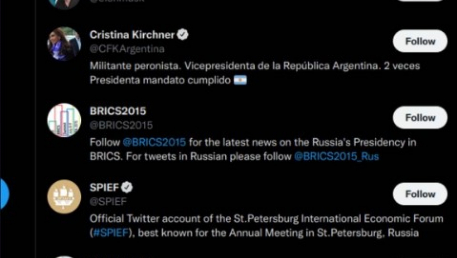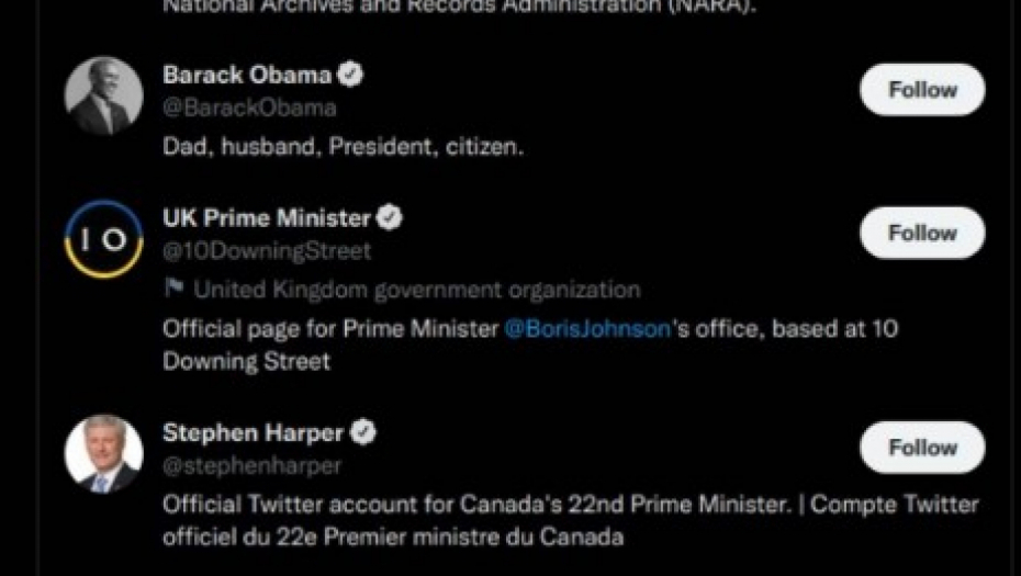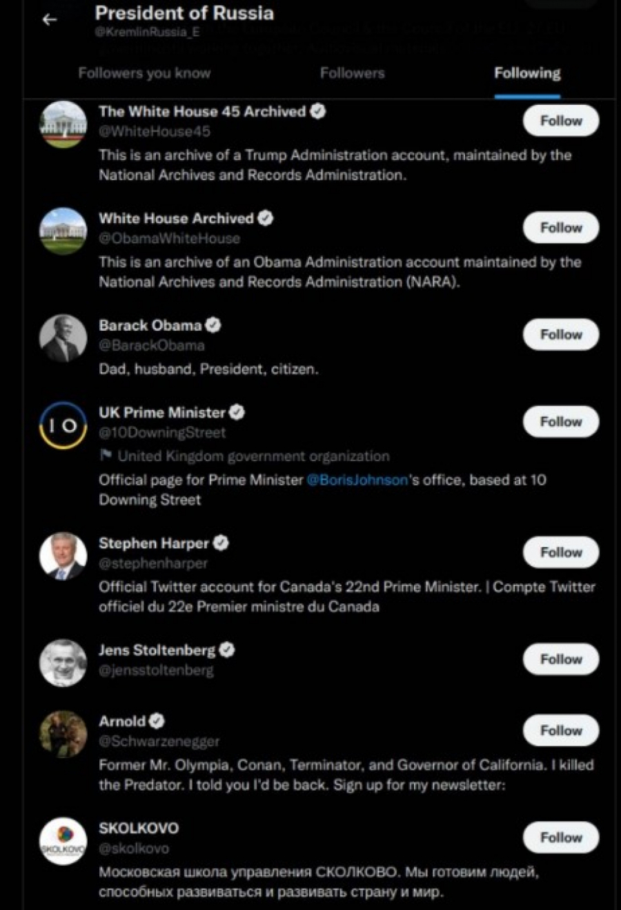 Ali, ono što je zanimljivo je da Putinov profil prati javne ličnosti i političare sa Zapada kao što su glumac Arnold Švacerneger i američki milijarder Ilon Mask. Tu su i bivši predsednik SAD Barak Obama, bivši kanadski premijer Stefan Harper, generalni sekretar NATO Jens Stoltenberg i profil aktuelnog britanskog premijera Borisa Džonsona.