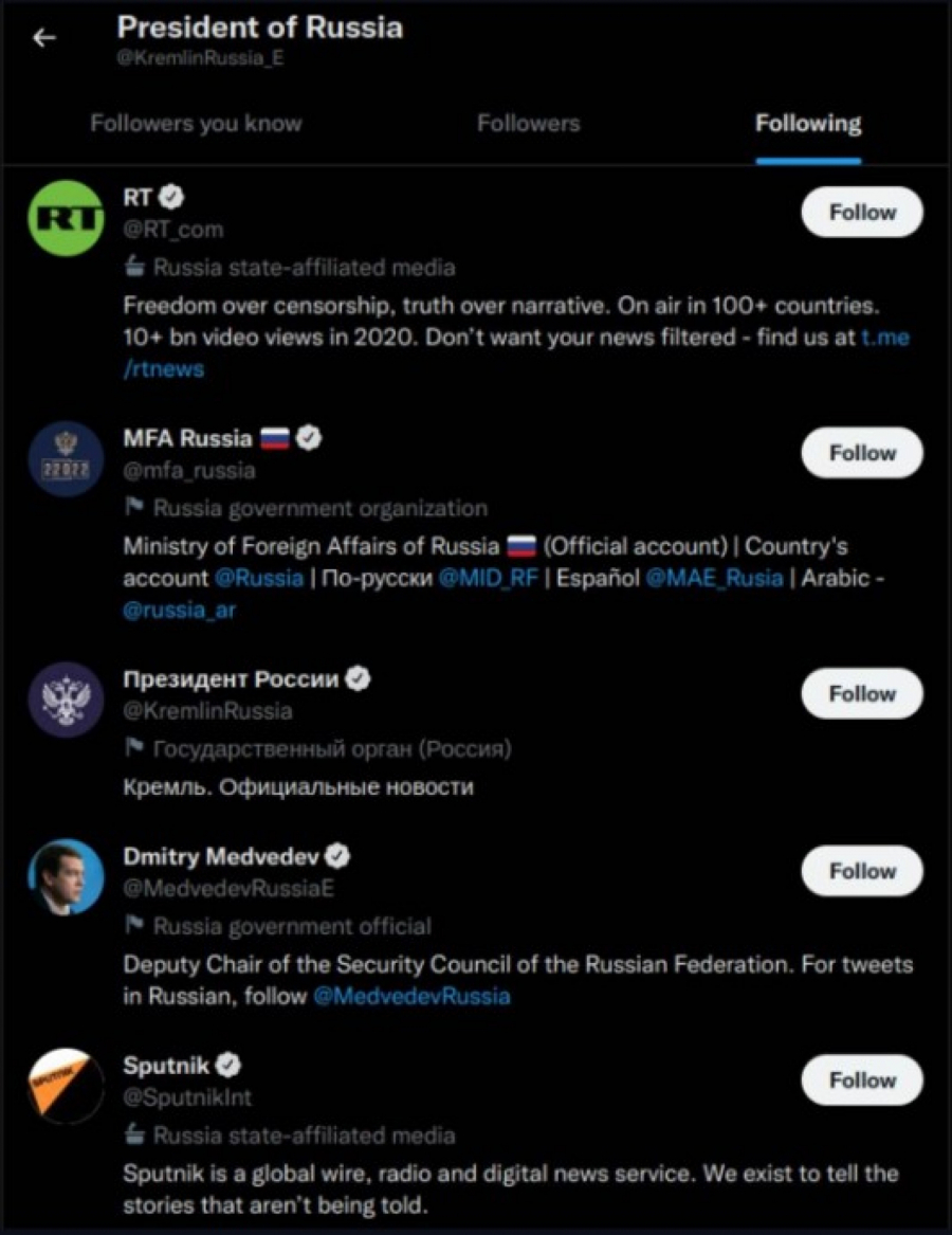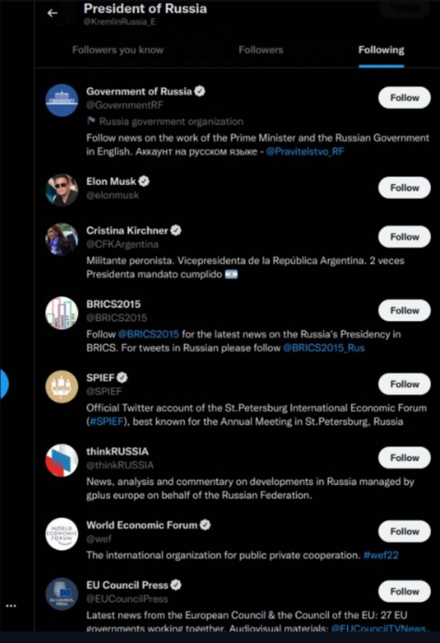 Neki profili koje predsednik Rusije Vladimir Putin prati neće nikoga iznenaditi, kao što su ruske medijske platforme RT i Sputnjik, zvanični nalog Ministarstva spoljnih poslova Rusije i ruski političar Danil Medvedev.