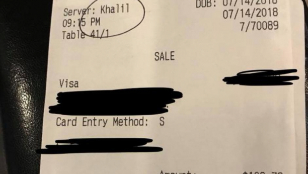 Fotografija je dokaz da gosti nisu ostavili nikakav bakšiš za račun od 108,73 dolara i da su mu namerno zaokružili ime (Khalil).