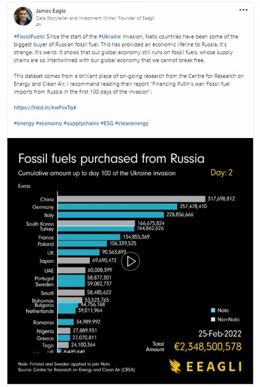 Ovaj skup podataka potiče iz briljantnog dela tekućeg istraživanja Centra za istraživanje energije i čistog vazduha. Preporučujem da pročitate njihov izveštaj „Finansiranje Putinovog rata: uvoz fosilnih goriva iz Rusije u prvih 100 dana invazije“. - napisao je on.
