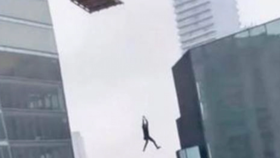 Samo se jednom rukom držao za komad užeta, a ispod njega su se nalazile palete građevinskog materijala. Zastrašujući snimak koji se dogodio u utorak podeljen je na društvenim mrežama, a pretpostavlja se da su ga snimile kolege nesrećnog čoveka. U pozadini se čuju posmatrači koji su bili uplašeni za čovekov život kako viču: "Držite se!" čoveku, dok on mlatara nogama visoko iznad zemlje. U jednom trenutku na snimku, čovekova kaciga pada.