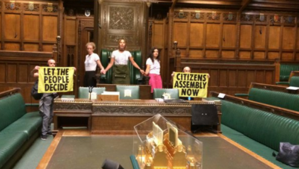 Pripadnici klimatskog pokreta "Pobuna protiv izumiranja" (Extinction Rebellion) upali su danas u salu za zasedanja Donjeg doma britanskog parlamenta, koji inače sada ne zaseda, i zalepili se super-lepkom oko stolice predsedavajućeg, saopštila je ta grupa na svom Tviter nalogu.
