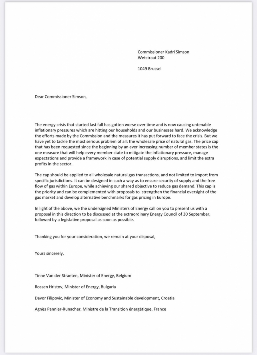 U pismu evropskom komesaru za energetiku Kadru Simsonu, koje je prenelo više stranih medija, ministri naglašavaju da se povećava broj država članica koje podržavaju uvođenje gornje granice cene gasa. Smatraju da će ograničavanje cene prirodnog gasa omogućiti svim članicama da ublaže inflatorni pritisak, uspostave okvir za delovanje u slučaju poremećaja u snabdevanju i ograniče višak profita u sektoru.