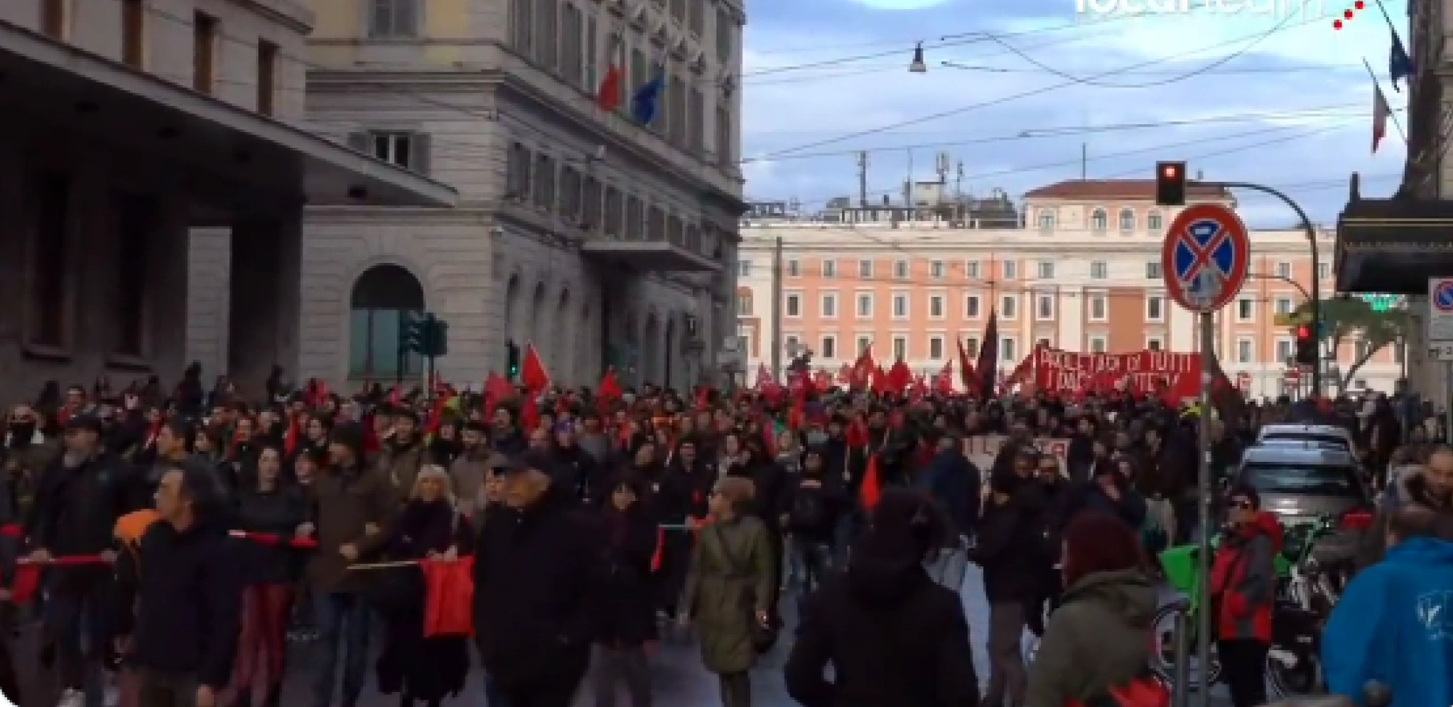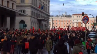 U organizaciji italijanskog sindikata USB i uz podršku brojnih levičarskih političkih frakcija, na protestu su se hiljade ljudi okupile na Trgu Republike i marširali iza transparenta sa natpisom „Oružje dole, plate više“.